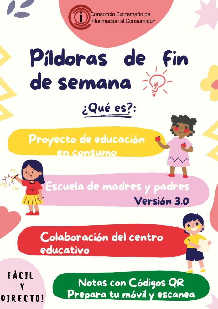 Se trata de una herramienta en forma de escuela de madres y padres versión 3.0, que estamos ofertando a los centros educativos de Extremadura para los niveles de educación infantil y primaria. A través de notas impresas, los más pequeños llevan a casa Códigos QR para acceder a la información que tenemos preparada en cuanto a etiquetado de productos, publicidad o redes sociales, entre otros. Con esta manera de interactuar facilitamos un horario flexible a la educación en consumo desde nuestros hogares.