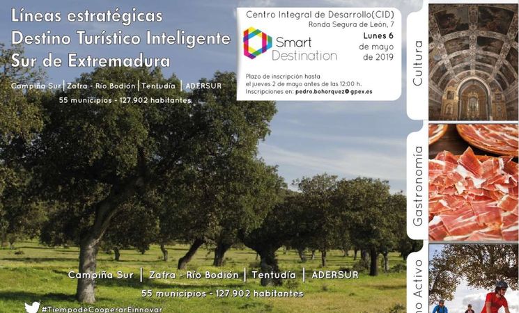 La Dirección General de Turismo de la Junta de Extremadura celebrará el próximo lunes, 6 de mayo en el Centro Integral de Desarrollo (CID) de Tentudía ,situado en Monesterio, unas jornadas informativas sobre las líneas estratégicas para la creación de Destinos Turísticos Inteligentes en el Sur de Extremadura, que comprenden cultura, gastronomía y turismo activo.